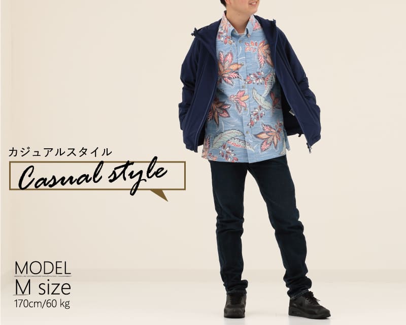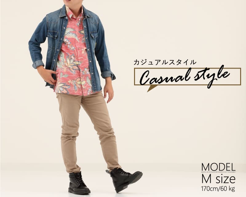 暑い夏は沖縄アロハシャツと、足元はロールアップで涼しく演出。