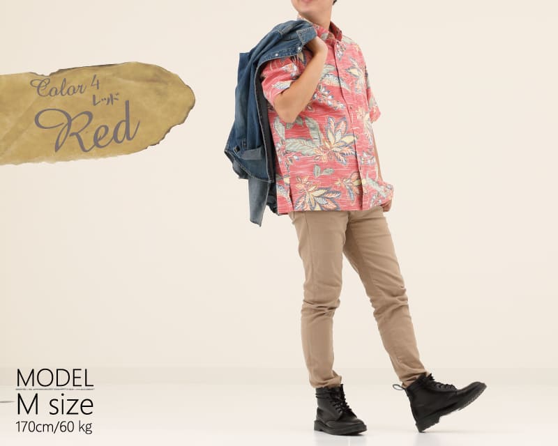 アロハ好きにはたまらない。絶妙なレッド。デザインにベージュが入っているのでベージュのチノパンとの相性が良いです♪