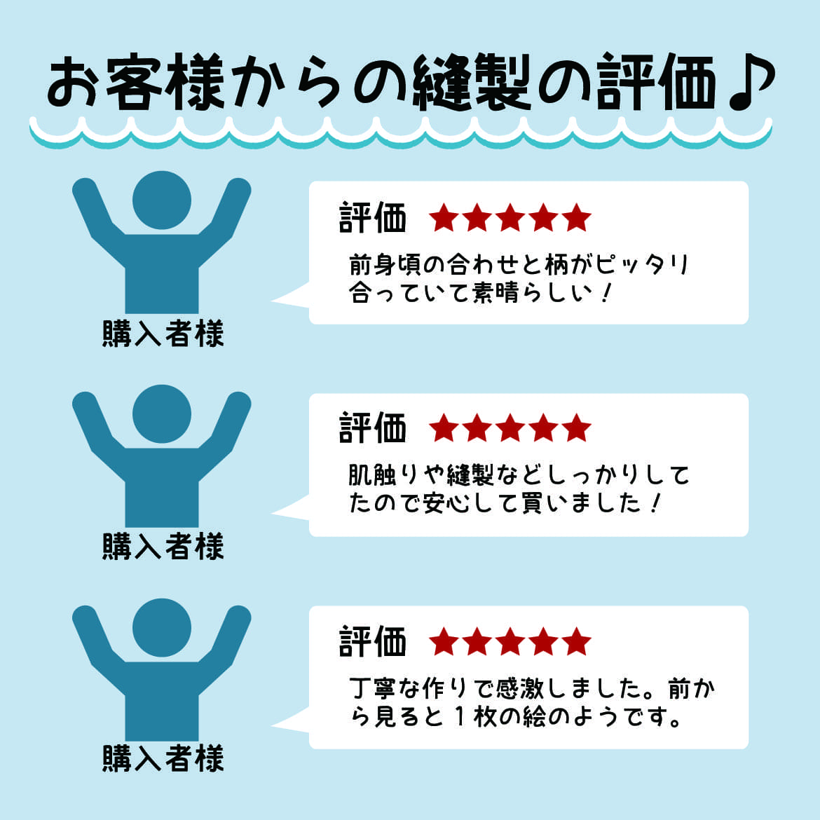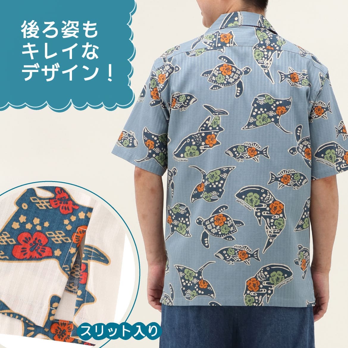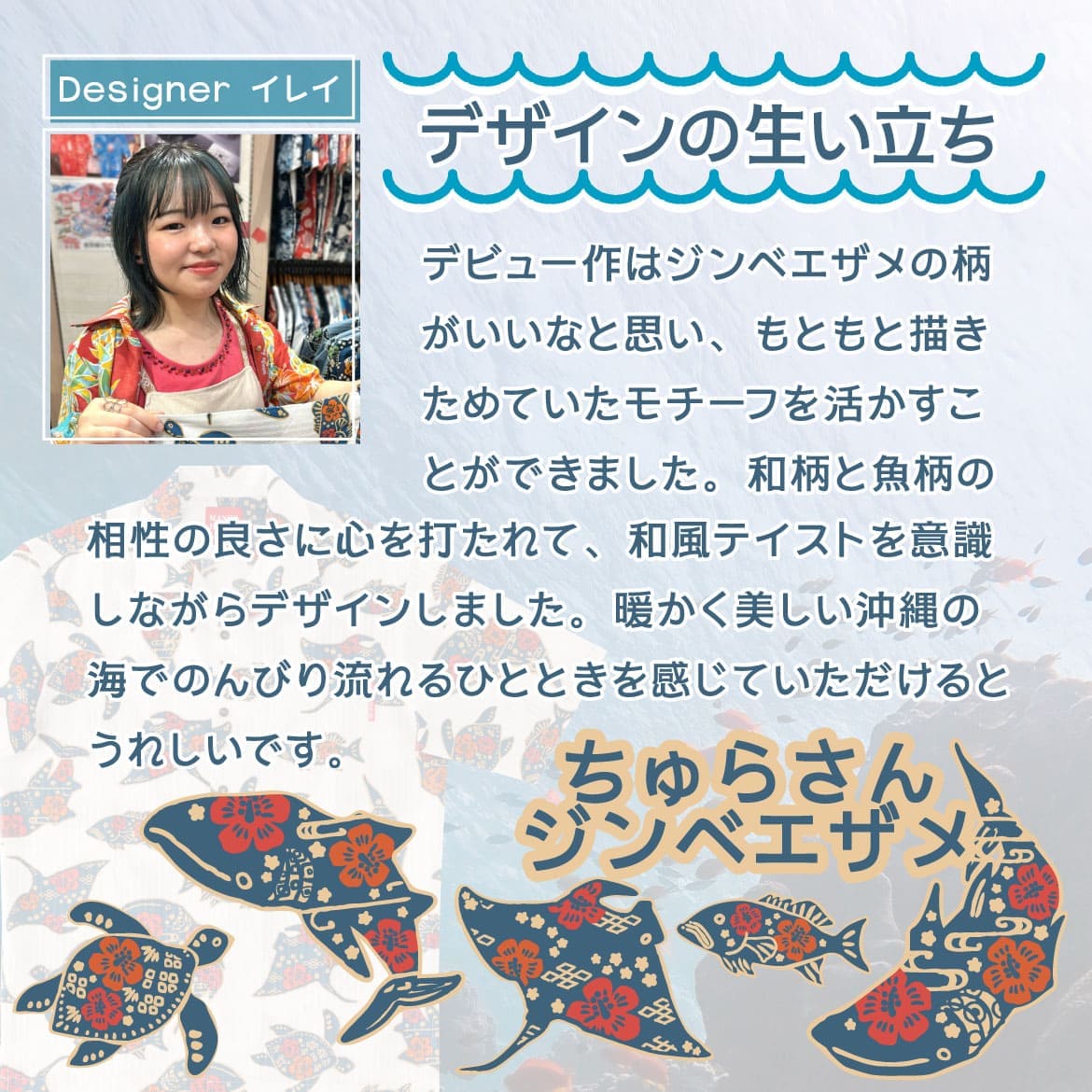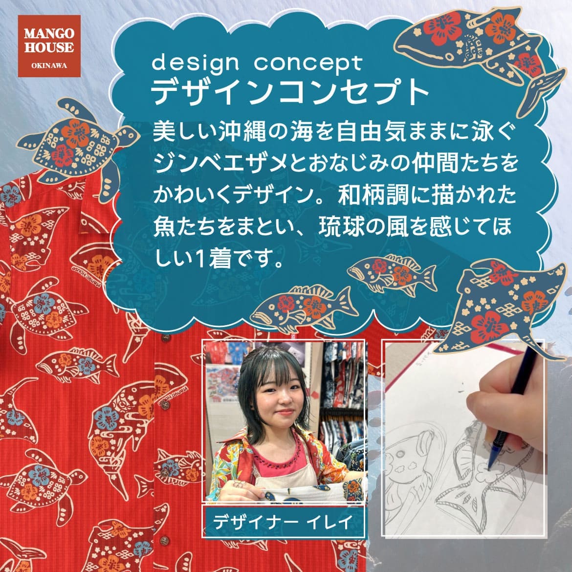 美しい沖縄の海を自由気ままに泳ぐジンベエザメとおなじみの仲間たちをかわいくデザイン。和柄調に描かれた魚たちを纏い、琉球の風を感じて欲しい1着です。