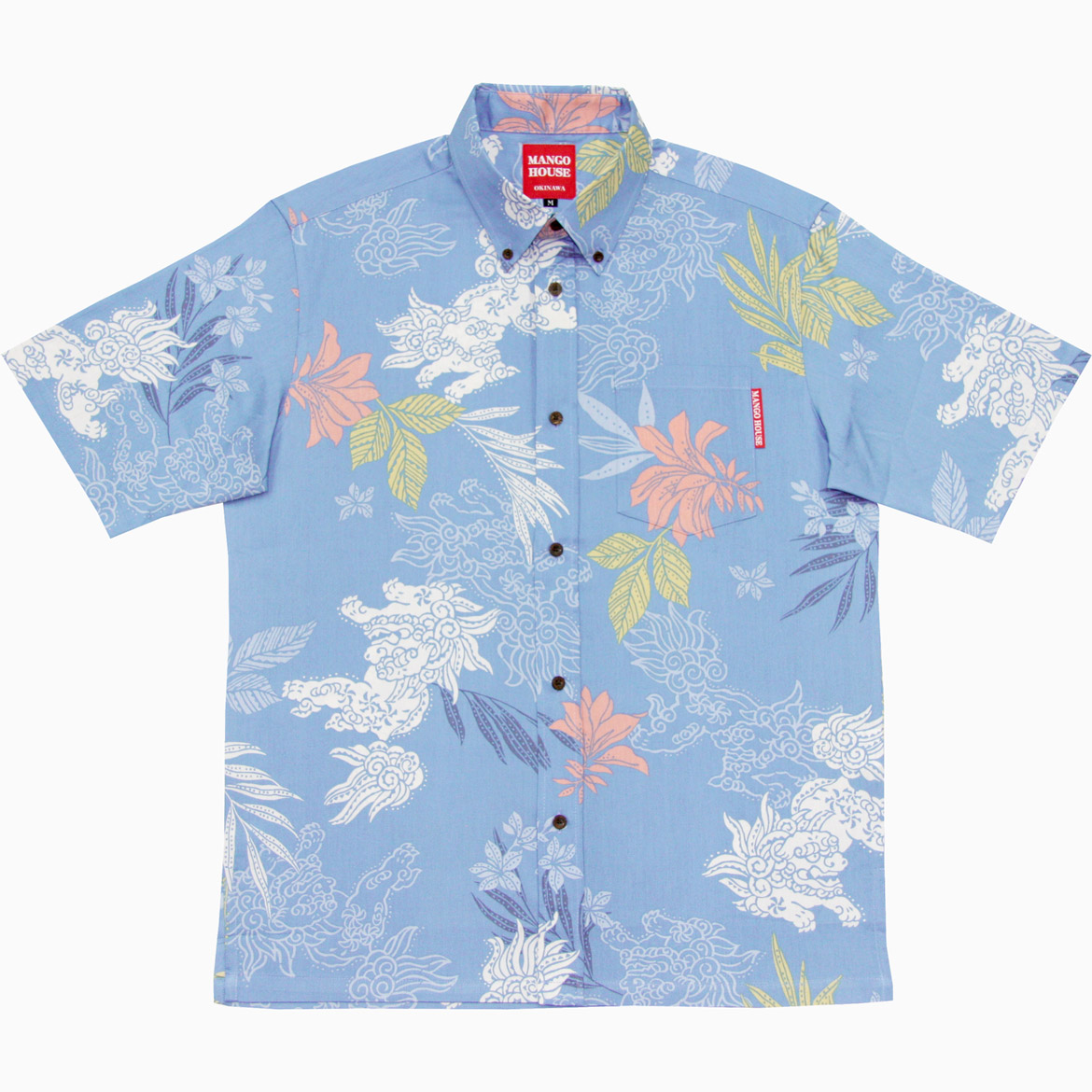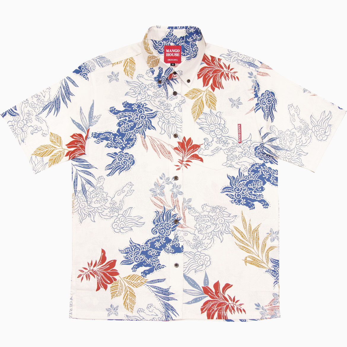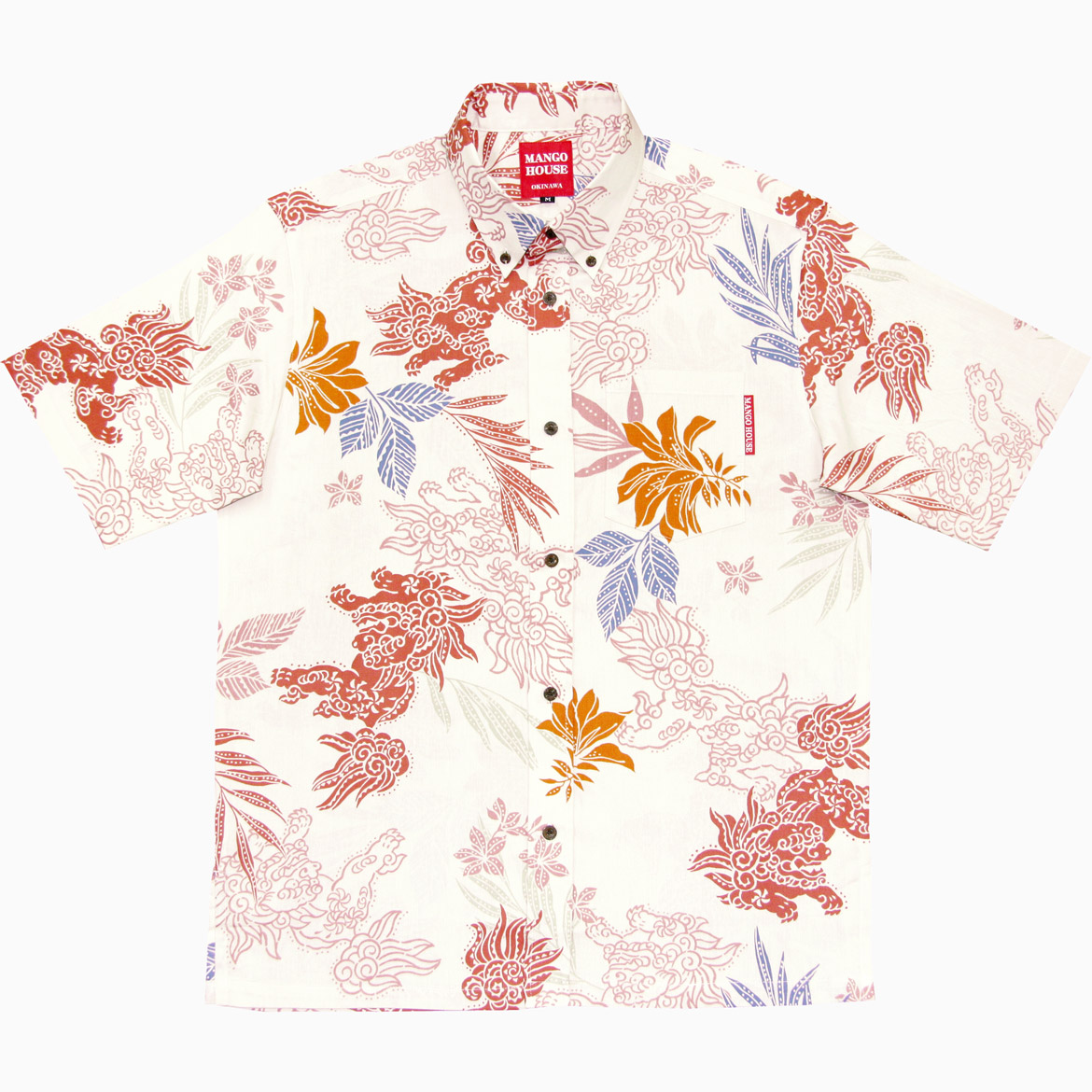 沖縄の守り神「シーサー」と県を代表する花「デイゴ」をトーンを抑えた色合いで表現。落ち着いた色みが大人の印象を与えてくれるのと同時にアジアンリゾート感も演出するアロハシャツ(かりゆしウェア)。