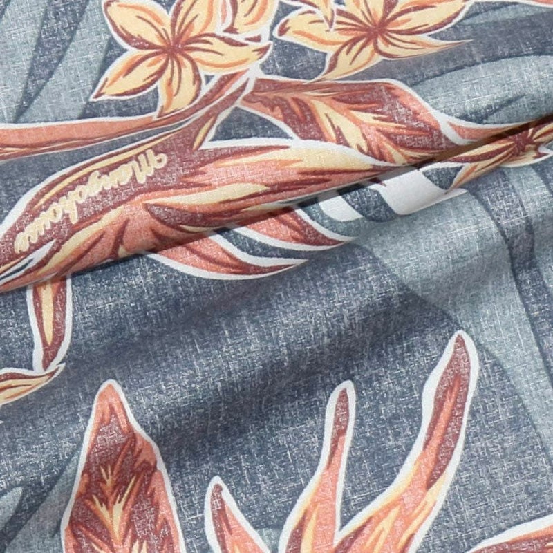 ストレチアの花とヤシの葉をシックで涼しげにアレンジ、裏地を使った独特な風合いとヤシに隠れている魚やウミガメがオシャレ感をプラスした一着。