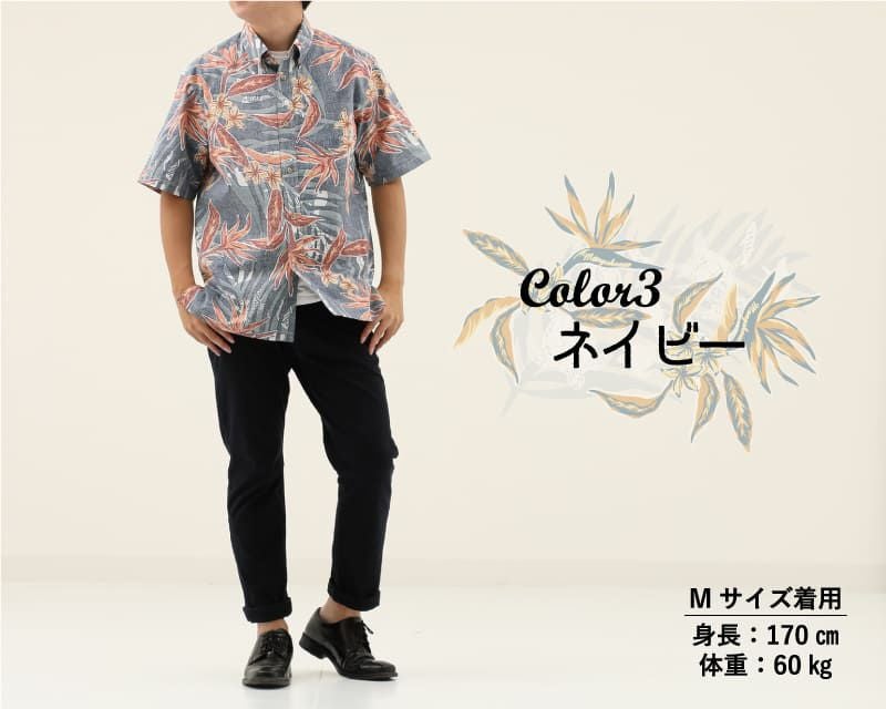 爽やかで遊びゴコロ感じるメンズ沖縄アロハのボタンダウンシャツ ネイビー