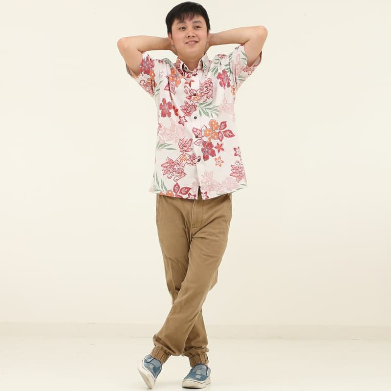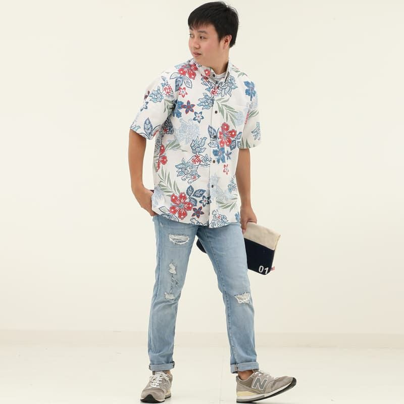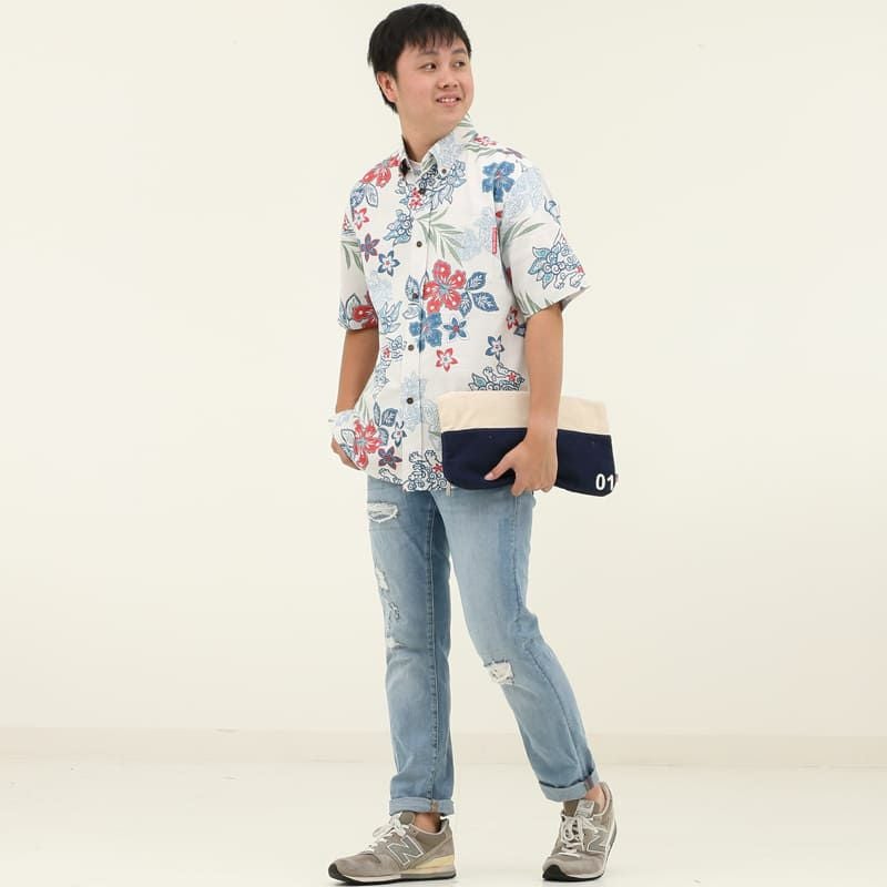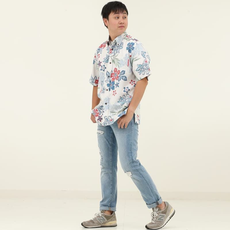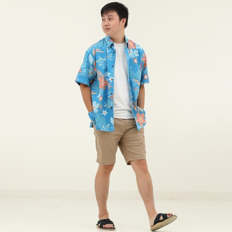 暑い夏には、最も清涼感を感じるこのカラー!キラリと映えるハイビスカスやプルメリアの朱色が、品のある華やかさを演出。オフブルーはメンズで一番人気のカラーです。