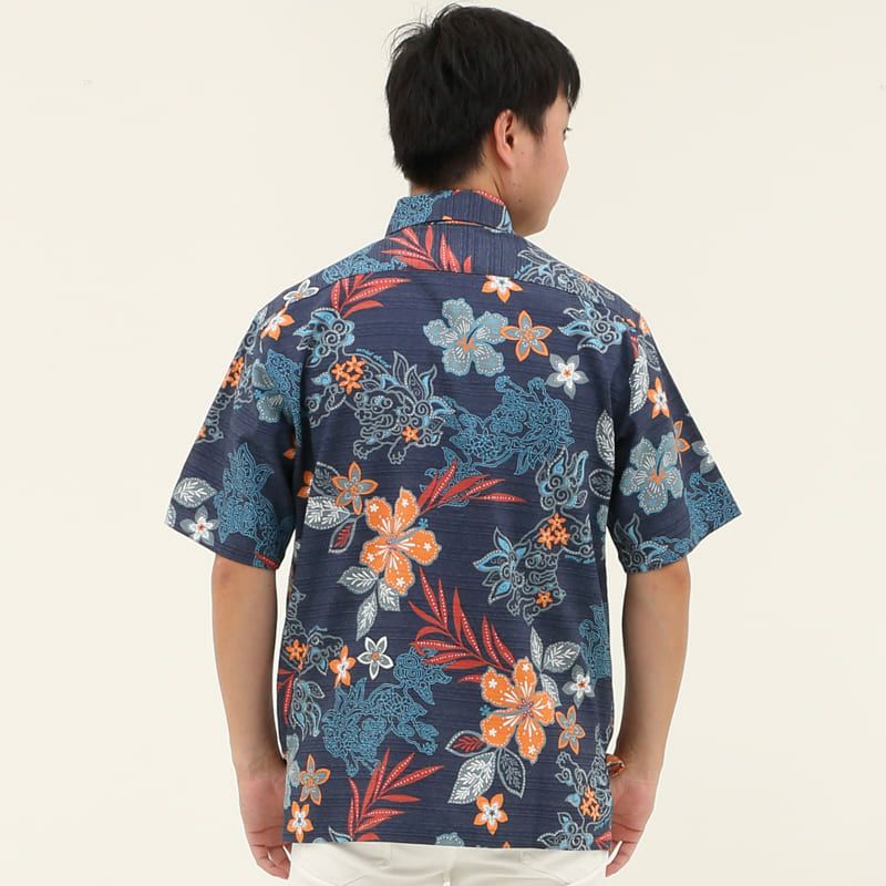 南の島のシーサーが南国気分にお出迎え『めんそーれー』!!沖縄の照り付ける太陽の元で、のびのび育ったシーサーとハイビスカスが南国気分を盛り上げる沖縄のアロハシャツ(かりゆしウェア)。