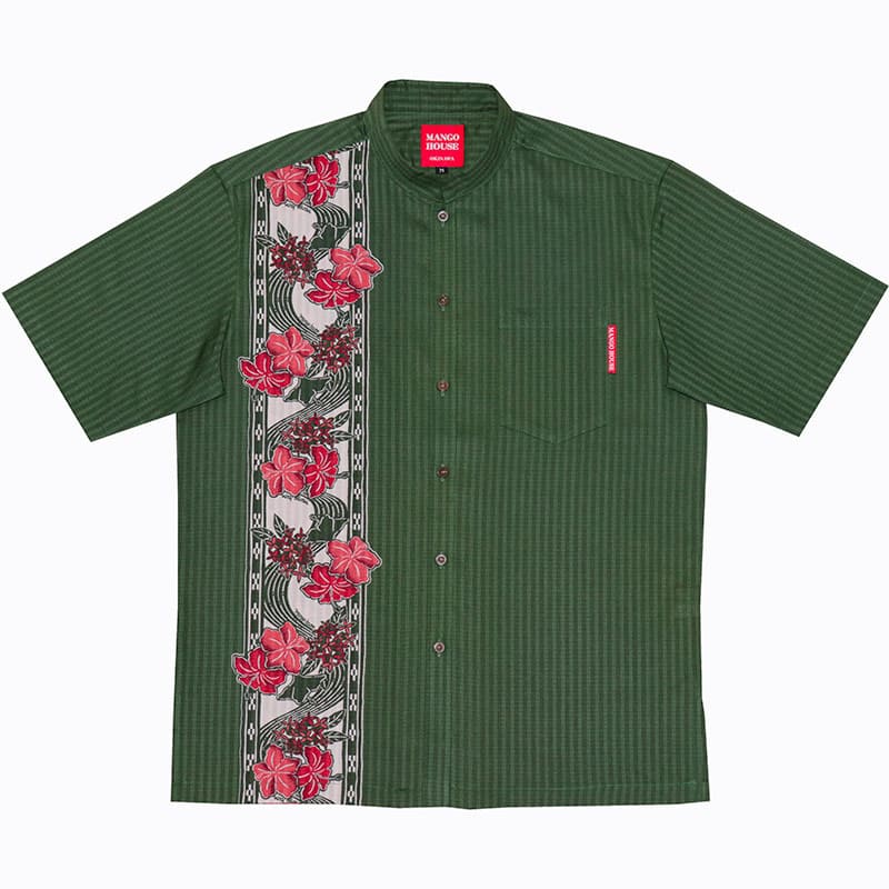 紅型モチーフで大人雰囲気を演出するボーダー柄の沖縄アロハシャツ グリーン 紅型モチーフで大人雰囲気を演出するボーダー柄の沖縄アロハシャツ グリーン