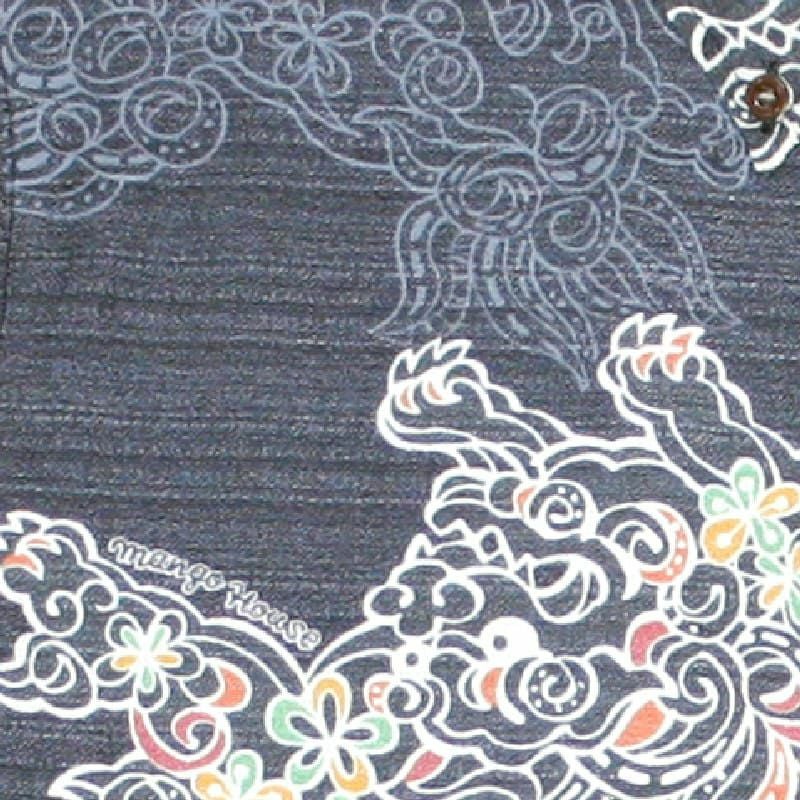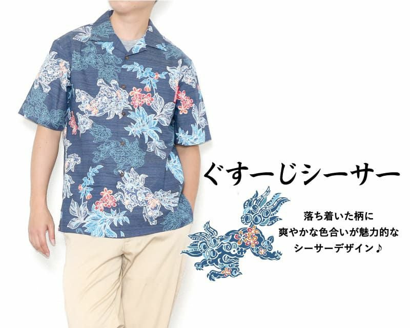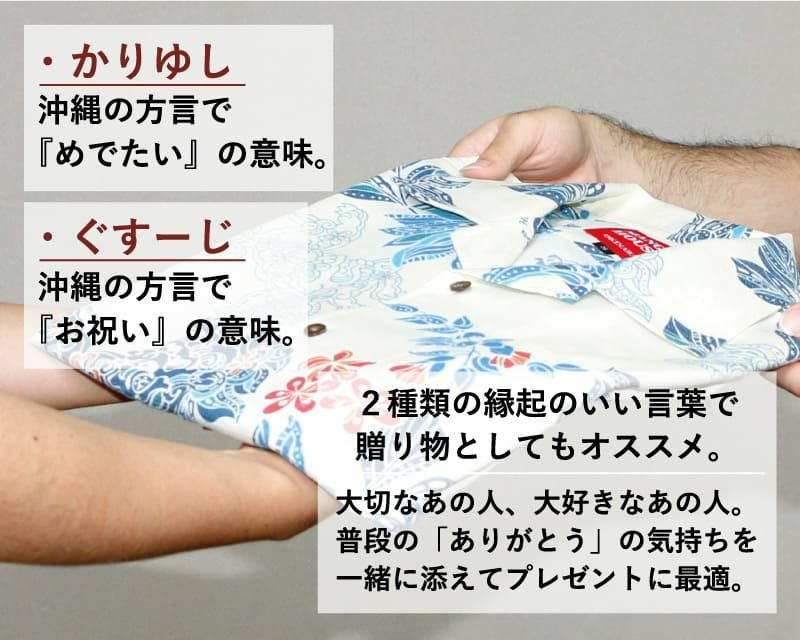 沖縄の方言で、ぐすーじとは『お祝い』の意味で、かりゆしは『おめでたい』の意味。その両方をかけた縁起の良いシーサー柄は、お仕事やカジュアルであなたを引き立てる一着。