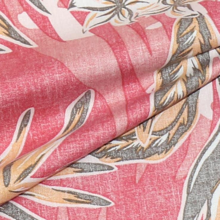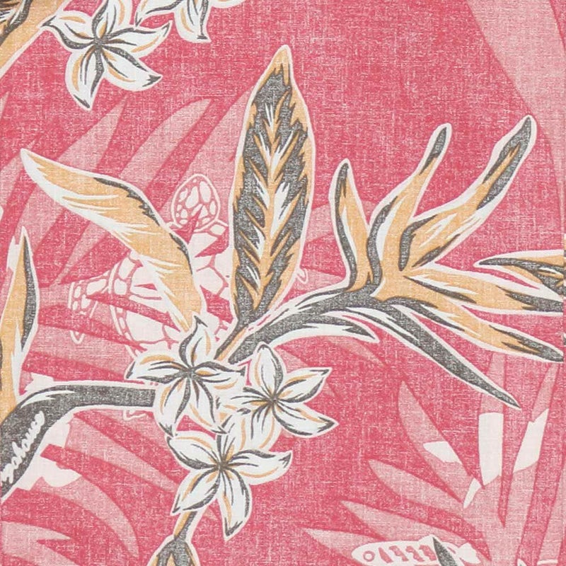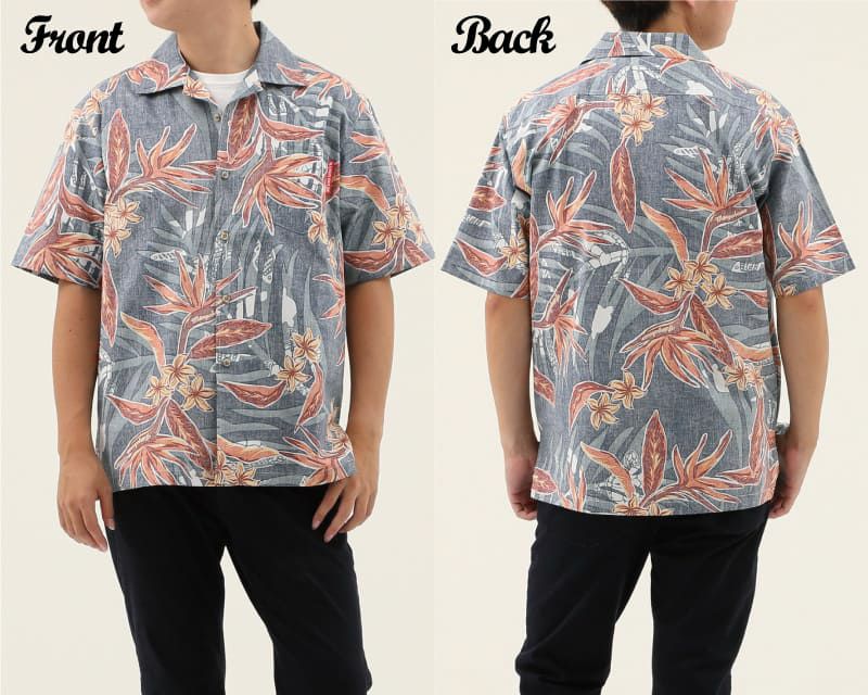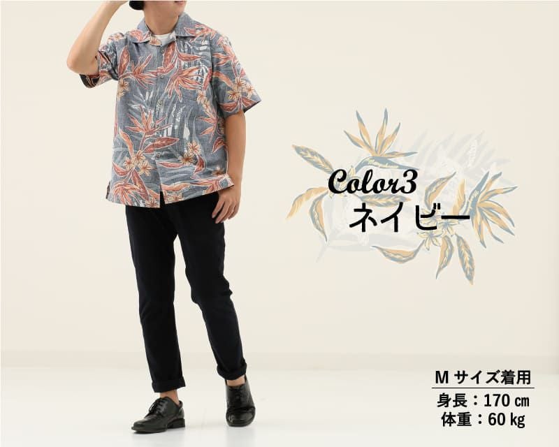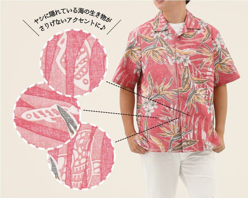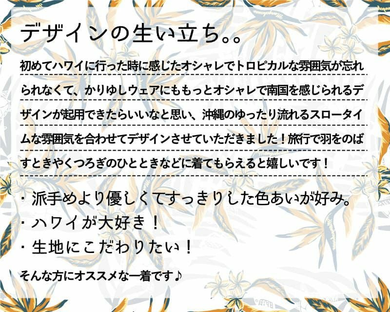 ストレチアの花とヤシの葉をシックで涼しげにアレンジ、裏地を使った独特な風合いとヤシに隠れている魚やウミガメがオシャレ感をプラスした一着。
