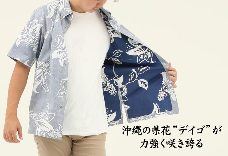 沖縄の県花であるデイゴを力強い輪郭で描いた、凛々しく貫禄のある大柄なデザイン。飾りすぎず、しかし確実に周りと差をつけたい時に活躍する一着!