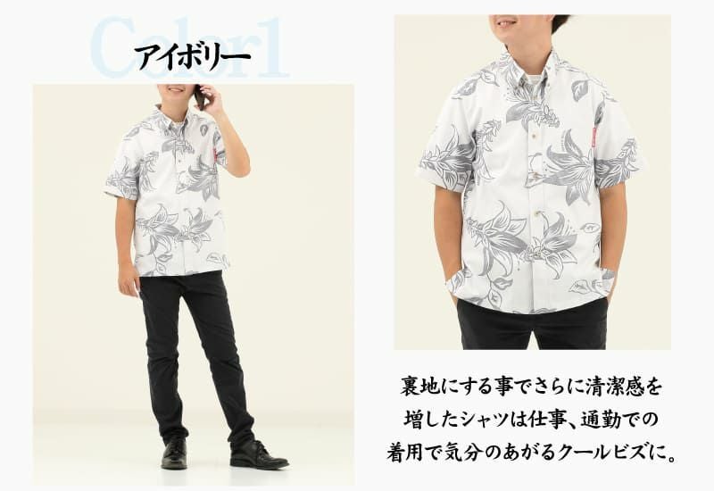 沖縄の県花・デイゴ柄メンズ裏地アロハシャツ アイボリー