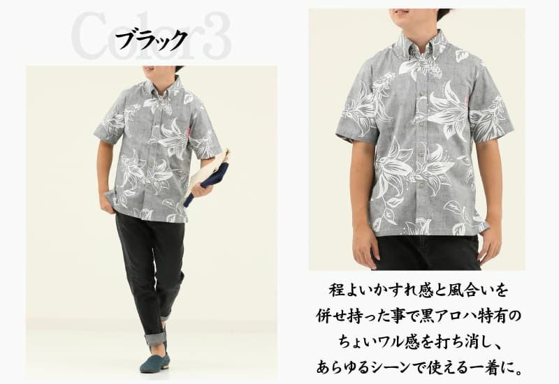 沖縄の県花・デイゴ柄メンズ裏地アロハシャツ ブラック