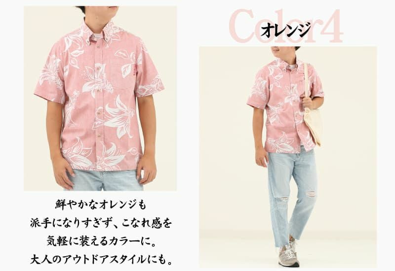 沖縄の県花・デイゴ柄メンズ裏地アロハシャツ オレンジ