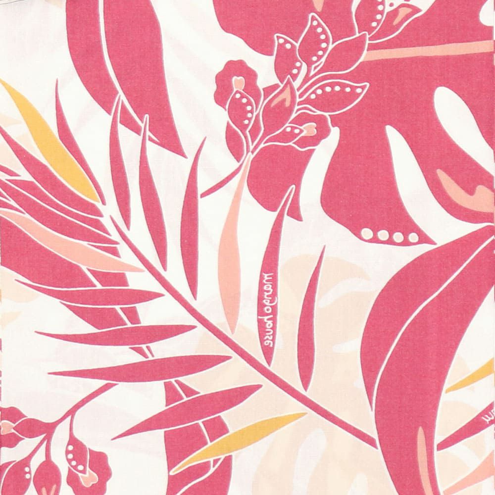 南国の草花の月桃とモンステラを大胆なタッチで表現、隙間風が感じられそうな涼し気な雰囲気が、夏場のカジュアル着として大活躍が間違いなしの一着。