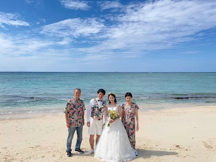 台湾と沖縄の家族や親戚、友達がたくさん集まってくれて楽しかったです。家族お揃いのかりゆしウエアは家族や友人から好評でした。
