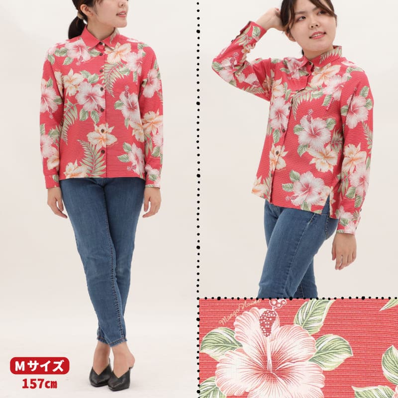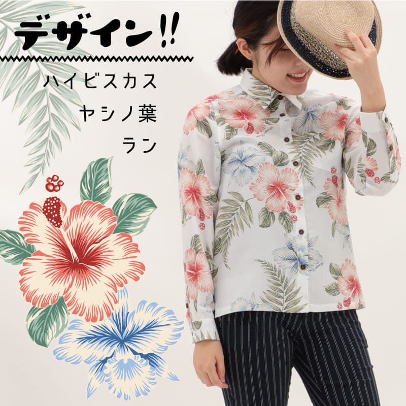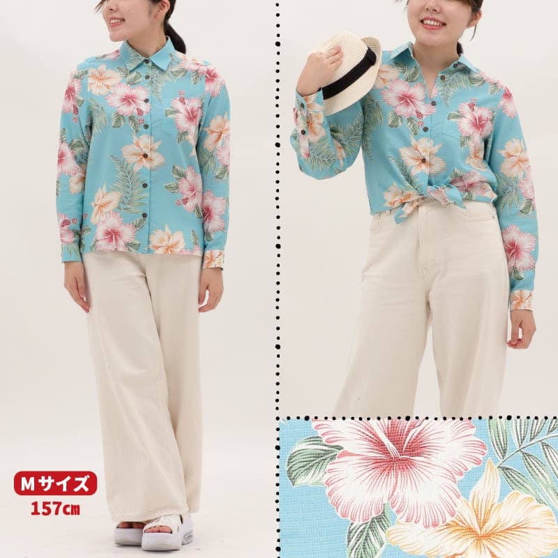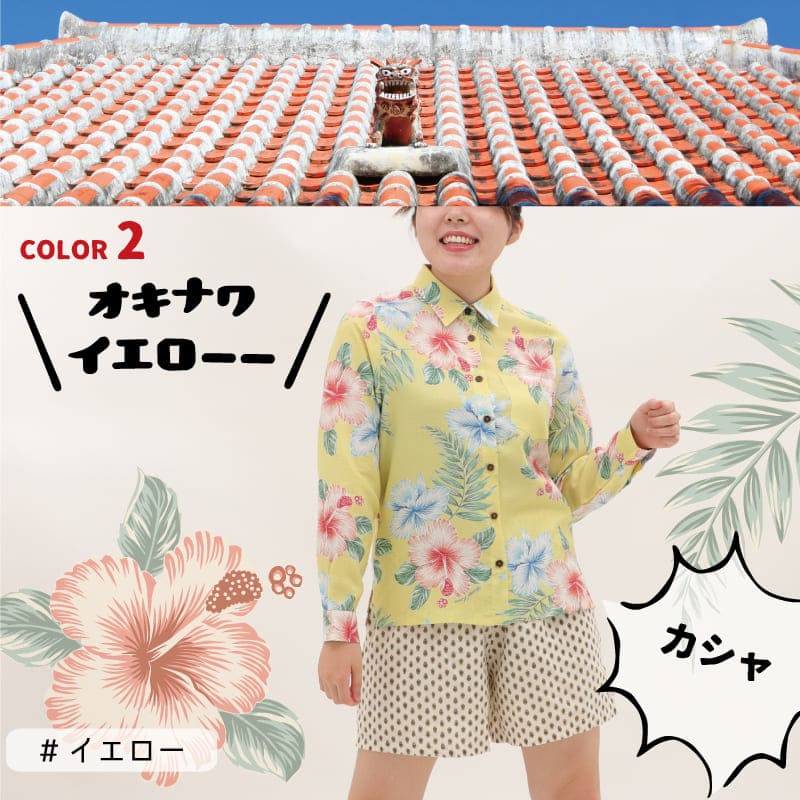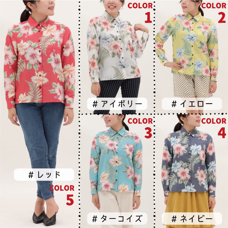 サイズ:S.M.L.LL.3L レディース 長袖シャツ オキナワンハイビー (レギュラーカラー)