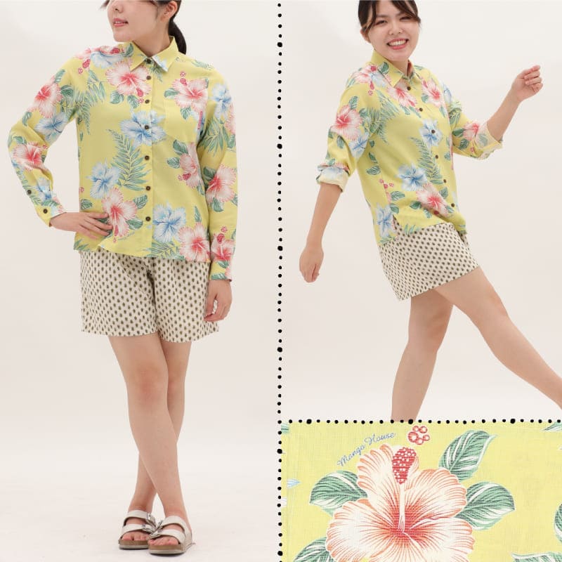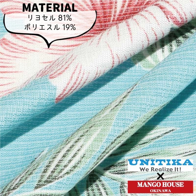 沖縄へ行った気分になるアロハ カラーバリエーション アイボリー、イエロー、ターコイズブルー、ネイビー、レッド デザイン ヤシの葉、ハイビスカス、ラン リヨセル81%ポリエステル19%混紡生地 「MANGOHOUSE」オリジナル素材