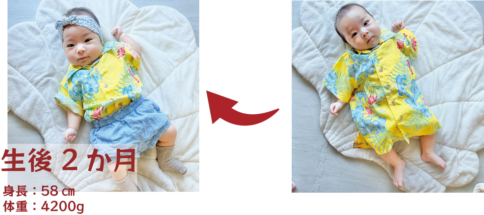 赤ちゃんの成長はとっても早い。最近まで着ていた洋服もあっという間に着られなくなってしまいます。少しでも長く着られるようにマンゴハウスでは、一番人気の多い90cmからお作りしています。それでも、生後2,3か月の赤ちゃんには90cmは大きいのですが、ひと手間シャツをパンツの中に入れて、袖を捲くればちょうどいいサイズ感で着られます。個人差もありますが、90cmなら1~2歳になっても着られるので長くご愛用頂けます。