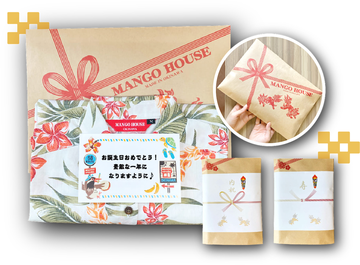 マンゴハウスのギフトラッピングは、お誕生日や記念日、結婚式(ウエディングギフト)、長寿祝いに、内祝いなど様々なシーンでご利用いただけるように心を込めてご準備いたします。