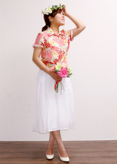ピンクのかりゆしウェアが女性らしくて、