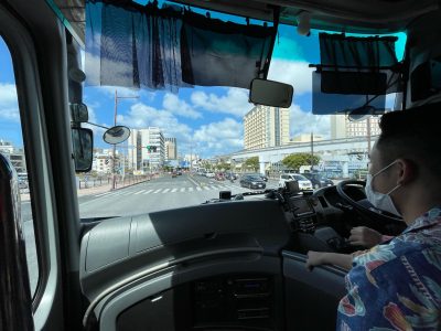 国道58号線を通って行きます。カラフルでとっても目立つアイランド号なので、ドライバーの皆さま道ゆく方々びっくりされたでしょうね笑