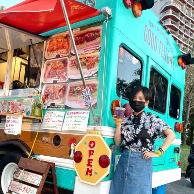 こちらの水色のキッチンカーは「Good Fellows58」さま。沖縄県産のラフテーと鶏肉をメインに健康的でバランスの良いサンドやオーバーライスをご提供♡