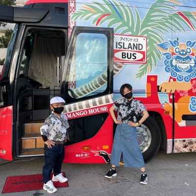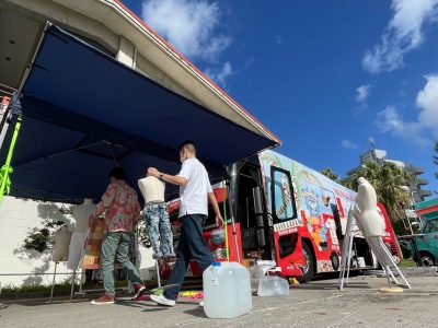 沖縄 マンゴハウスアイランド号 かりゆしウェア沖縄 マンゴハウスアイランド号 かりゆしウェア設営中。。。staffケースケとバスドライバーきんちゃんに力仕事はおまかせです。私は店内のディスプレイなどなどの準備。