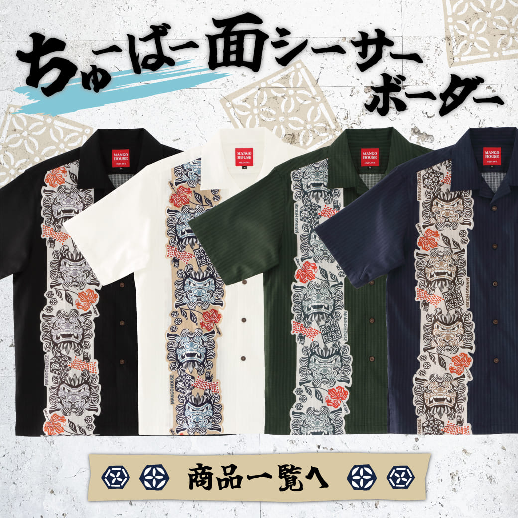 【かりゆしウェア新作商品】かっこよくてちゅーばーな表情をした面シーサーが幸運を招き入れてくれる頼もしい一着。『ちゅーばー面シーサーボーダー』