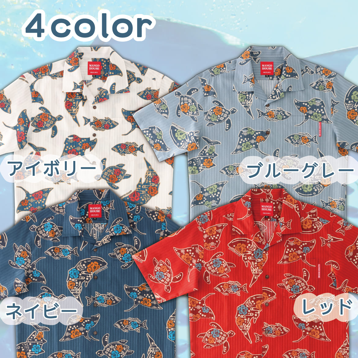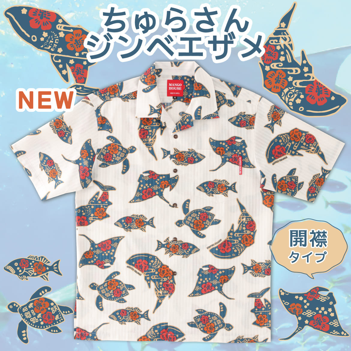【新作商品】大人気のジンベエザメが描かれたかりゆしウェアが新作入荷しました。『ちゅらさんジンベエザメ』