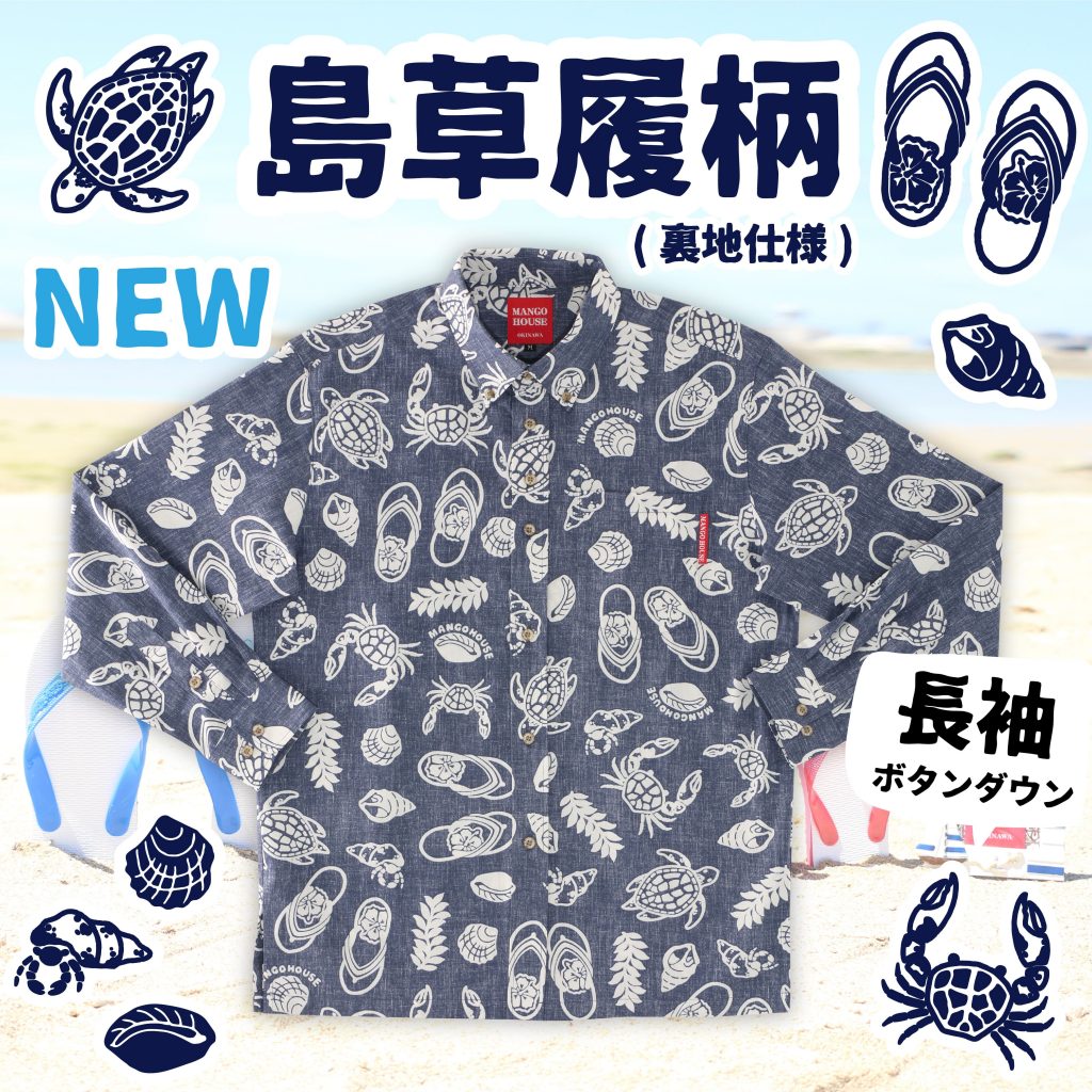 【新作商品:長袖かりゆしウェア】沖縄の砂辺を島草履で散歩するイメージで描いた『商品名:島草履』