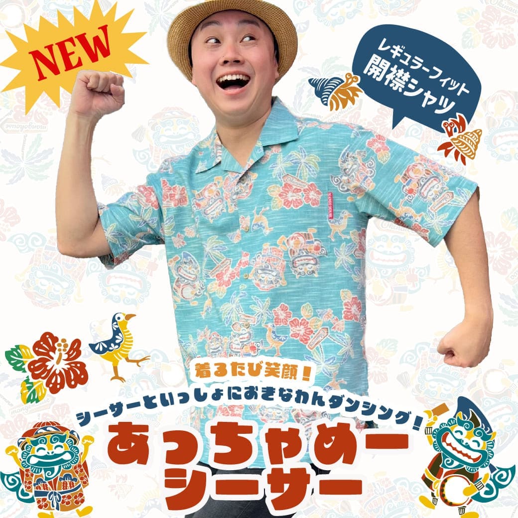 【新作商品】着るたび笑顔!シーサーといっしょにおきなわんダンシング『商品名:あっちゃめシーサー』