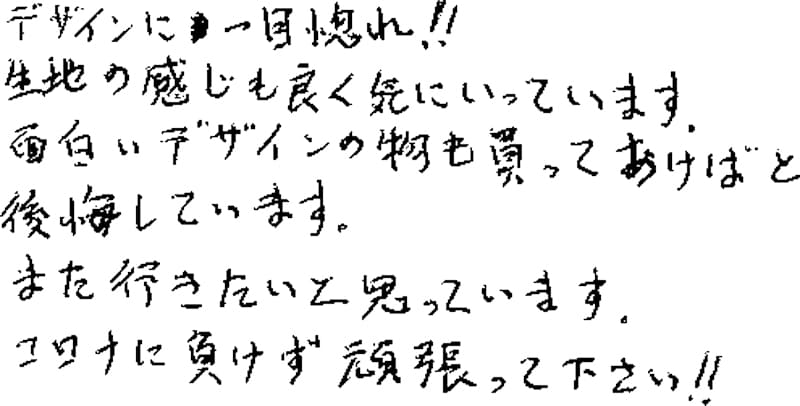 今回で3回目の購入です。デザイン・生地・着心地全て気に入ってます。いつの日か直接お店に伺う事が夢です!
