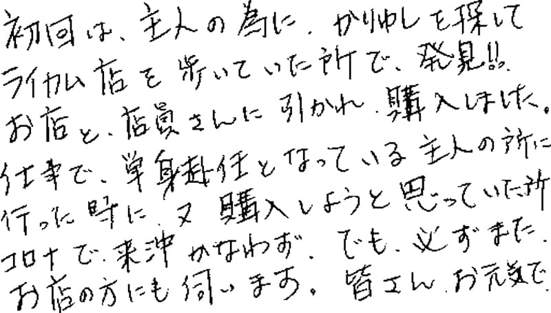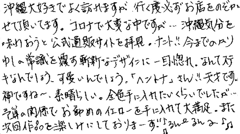 お店と店員さんに引かれ、購入しました。仕事で、単身赴任となっている主人の所に行った時に、又購入しようと思っていた所コロナで、来沖かなわず、でも、必ずまたお店の方にも伺います。皆さん、お元気で。
