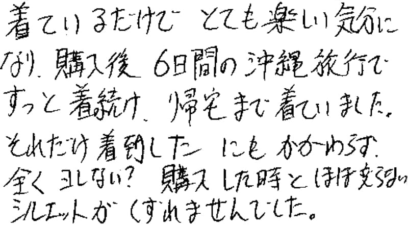 着ているだけでとても楽しい気分になり、購入後6日間の沖縄旅行でずっと着続け、帰宅まで着ていました。