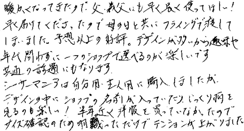 暖かくなってきたので、父、義父にも早く長く使ってほしい!早く届けてくださったので母の日と共にフライングで渡してしまいました。予想以上の好評。デザインが多いから趣味や年代問わずに一つのショップで選べるのが楽しいです。共通の話題にもなります。シーサーマニアは自分用、主人用に購入しましたが、デザインの中にショップの名前が入っていたり、じっくり柄を見るのも楽しい!半年近く洋服を買っていなかったのでサイズ確認のため羽織っただけでテンションが上がりました。