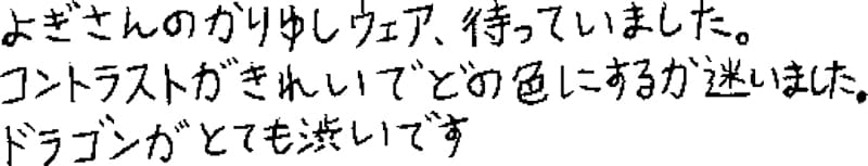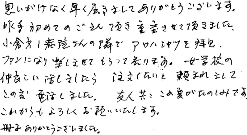 思いがけなく早く届きましてありがとうございます。昨年初めてのごえん頂き重宝させて頂きました。小倉第1病院さんの隣でアロハシャツを拝見。ファンになり楽しませてもらっております。女学校の仲良こに話しましたら注文したいと頼まれましてこの前電話しました。友人共この夏がたのしみです。これからもよろしくお願いいたします。冊子ありがとうございました。