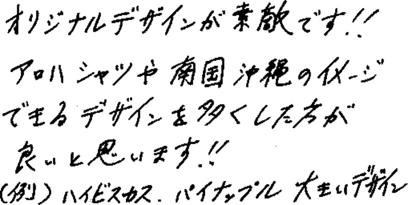 オリジナルデザインが素敵です!!アロハシャツや南国沖縄のイメージできるデザインを多くした方が良いと思います!!(例)ハイビスカス、パイナップル 大きいデザイン