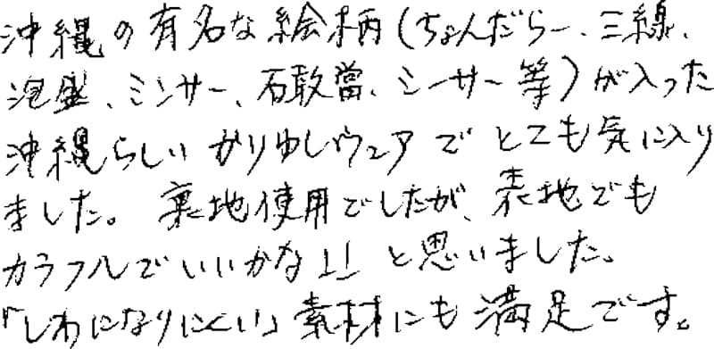 沖縄の有名な絵柄(ちょんだらー、三線、泡盛、ミンサー、石敢當、シーサー等)が入った沖縄らしいかりゆしウェアでとても気に入りました。裏地使用でしたが、表地でもカラフルでいいかな!!と思いました。「しわになりにくい」素材にも満足です。