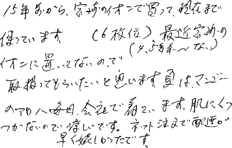 15年前から、宮崎のイオンで買って現在まで使っています。(6枚位)最近宮崎のイオンに置いてないので取り扱ってもらいたいと思います。夏は、マンゴーのアロハ毎日、会社で着ています。肌にくっつかないので涼しいです。ネット注文で配達が早く嬉しかったです。