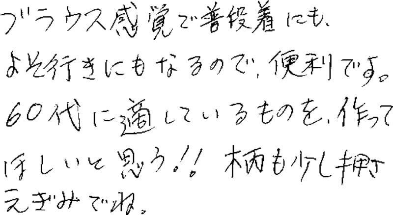ブラウス感覚で普段着にも、よそ行きにもなるので、便利です。60代に適しているものを、作ってほしいと思う!!柄も少し押さえぎみでね。