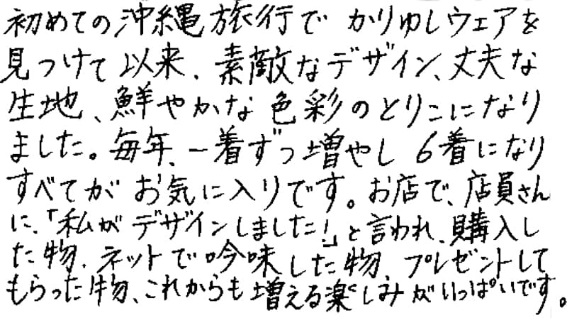 初めての沖縄旅行でかりゆしウェアを見つけて以来、素敵なデザイン、丈夫な生地、鮮やかな色彩のとりこになりました。毎年、一着ずつ増やし6着になりすべてがお気に入りです。お店で店員さんに、「私がデザインしました!」と言われ、購入した物、ネットで吟味した物、プレゼントしてもらった物、これからも増える楽しみがいっぱいです。
