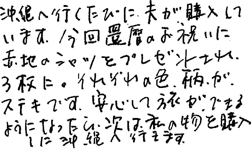 沖縄へ行くたびに夫が購入しています。今回還暦のお祝いに赤地のシャツをプレゼントされ、3枚に。それぞれの色、柄、がステキです。安心して旅ができるようになったら、次は私の物を購入しに沖縄へ行きます。