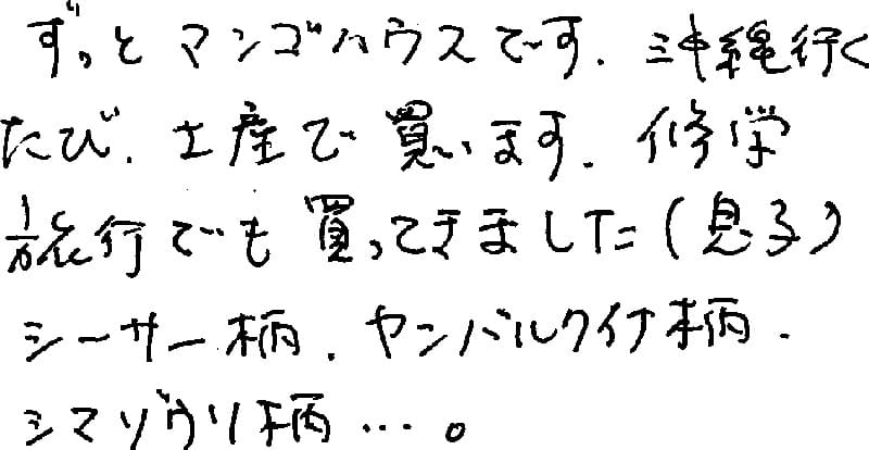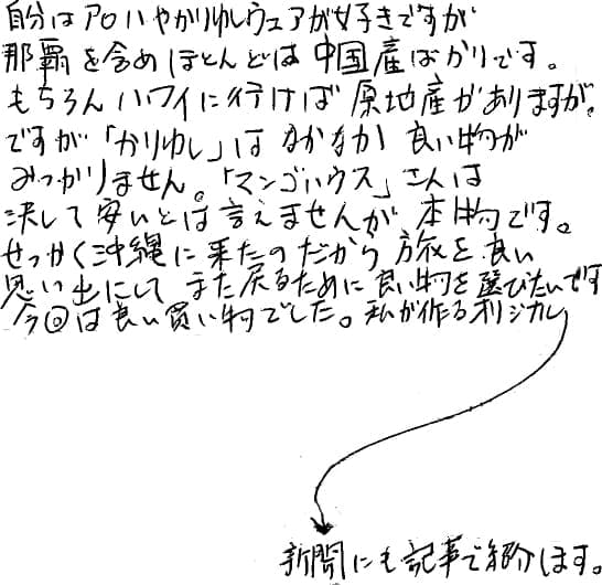 自分はアロハやかりゆしウェアが好きですが那覇を含めほとんどは中国産ばかりです。もちろんハワイに行けば原産地がありますが、ですが「かりゆし」はなかなか良い物がみつかりません。「マンゴハウス」さんは決して安いとは言えませんが、本物です。せっかく沖縄に来たのだから旅を良い思い出にしてまた戻るために良い物を選びたいです。今回は良い買い物でした。私が作るオリジナル新聞にも記事で紹介します。