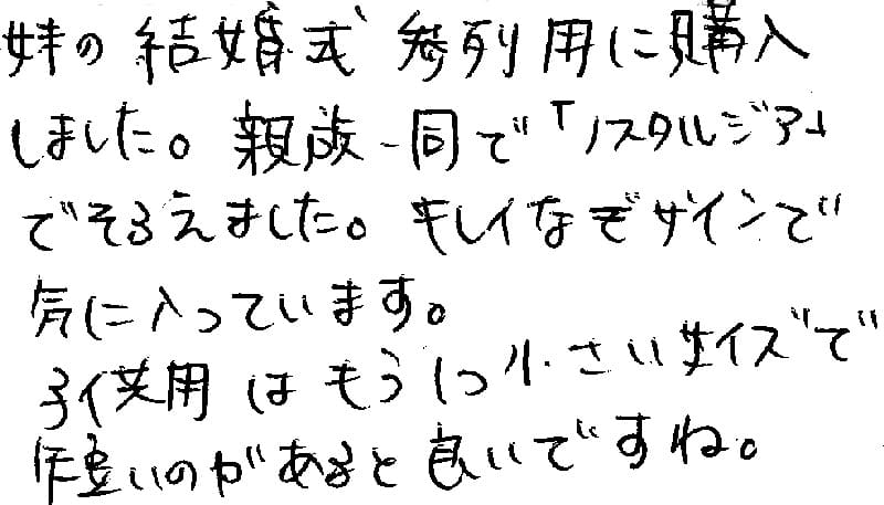 妹の結婚式参列用に購入しました。親族一同で「ノスタルジア」でそろえました。キレイなデザインで気に入っています。子供用はもう1つ小さいサイズで短いのがあると良いですね。