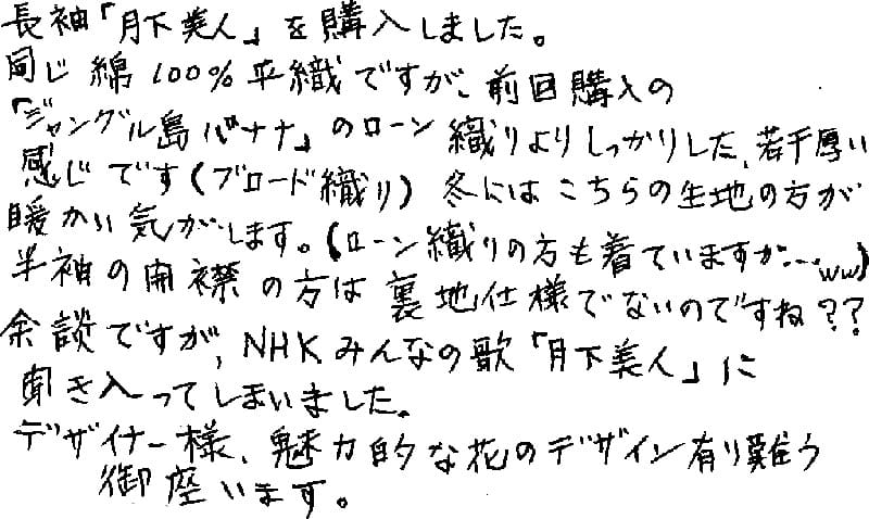 長袖「月下美人」を購入しました。同じ綿100%平織りですが、前回購入の「ジャングル島バナナ」のローン織りよりしっかりした、若干厚い感じです(ブロード織り)冬にはこちらの生地の方が暖かい気がします。(ローン織りの方もきていますが…ww)半袖の開襟の方は裏地仕様ではないのですね??余談ですが、NHKみんなの歌「月下美人」に聞き入ってしまいました。デザイナー様、魅力的な花のデザイン有り難う御座います。