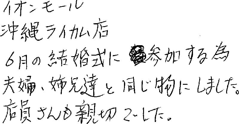 イオンモール沖縄ライカン店6月の結婚式に参加する為夫婦、姉兄達と同じ物にしました。店員さんも親切でした。
