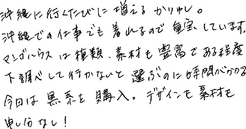 沖縄に行くたびに増えるかりゆし。沖縄での仕事でも着れるので重宝しています。マンゴハウスは種類、素材も豊富である程度下調べしていかないと選ぶのに時間がかかる今回は黒系を購入。デザインも素材も申し分なし!