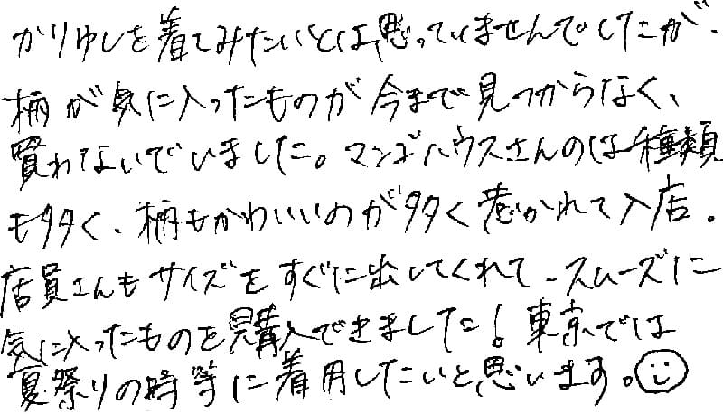 かりゆしを着てみたいとは思っていませんでしたが、柄が気に入ったものが今まで見つからなく、買わないでいました。マンゴハウスさんのは種類も多く、柄もかわいいのが多く惹かれて入店。店員さんもサイズをすぐに出してくれて、スムーズに気に入ったものを購入できました!東京では夏祭りの時等に着用したいと思います。