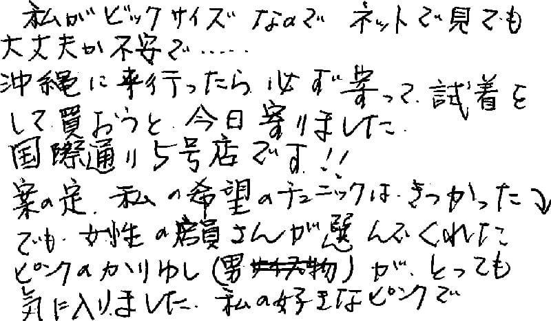 沖縄に行ったら必ず寄って試着をして買おうと今回寄りました。国際通り5号店です!!案の定、私の希望のチュニックはきつかった。でも女性の店員さんが選んでくれたピンクのかりゆし(男物)がとっても気に入りました。私の好きなピンクで