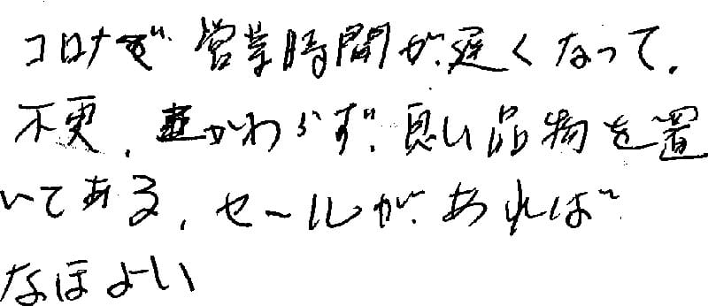 コロナで営業時間が遅くなって、不便、かわらず、良い品物を置いてある、セールが、あればなほよい。