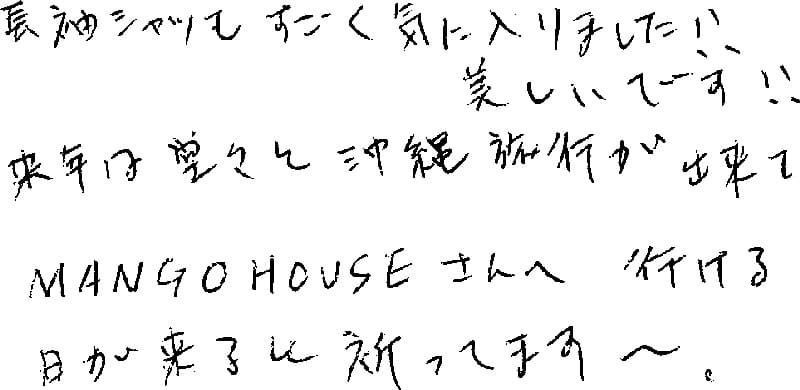 長袖シャツもすごく気に入りました!!美しいです!!来年は堂々と沖縄旅行が出来てMANGOHOUSEさんへ行ける日が来ると祈ってます~。