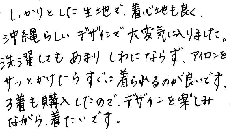 しっかりとした生地で、着心地も良く、沖縄らしいデザインで大変気に入りました。洗濯してもあまりしわにならず、アイロンをサッとかけたらすぐに着られるのが良いです。3着も購入したので、デザインを楽しみながら着たいです。